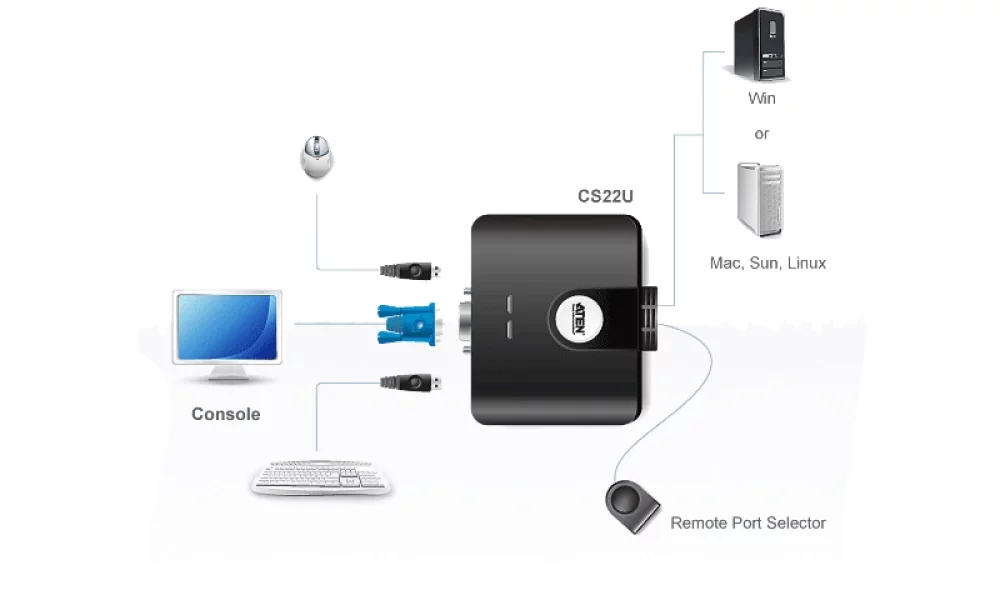 سوئیچ VGA دو پورت آتن CS22U یک روش بسیار سریع و آسان برای کنترل دو رایانه با پورت های VGA و USB است. این دستگاه دارای یک ریموت پورت انتخاب می باشدکه به کاربران اجازه می دهد در حالی که کنترل ریموت را در اختیار دارند دستگاه را خارج از دید قرار دهند. سوئیچ دو پورت VGA با ماوس و کیبورد USB آتن مدل CS22U ابزار جامع و کاربردی برای اتصال چندین منبع VGA به یک نمایشگر و اشتراکگذاری ماوس و کیبورد است.